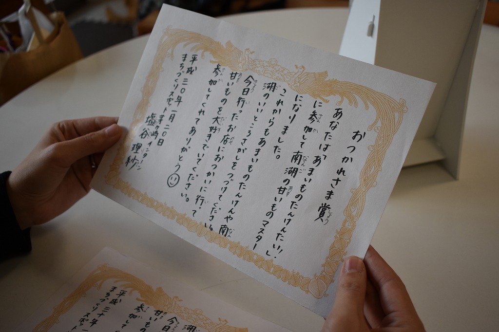 この企画を実施するにあたってアドバイスや準備のサポートをして頂いたまちスポスタッフの方々、協力して頂いたお店の方、参加してくださった方、私に関わって頂いたすべての方に感謝いたします。