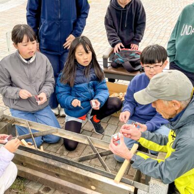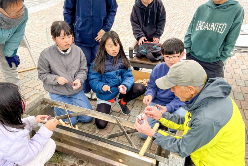 準備段階では小学生が、公園のかまどベンチを使って「かまど」の組立から火起こしに大活躍!