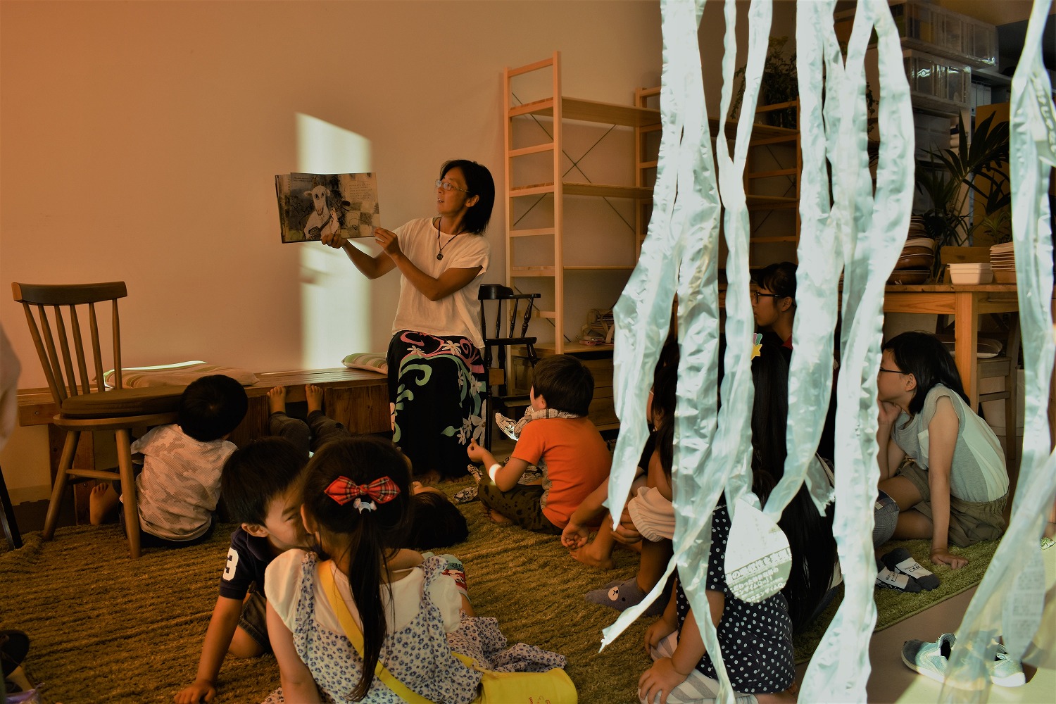 いつもまちづくりスポット茅ヶ崎の「みんなでほっこり絵本のじかん」で絵本を読んでいる