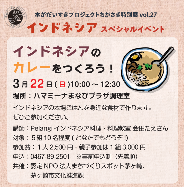 内容:インドネシアの本場ごはんを身近な食材で作ります。ぜひご参加ください。