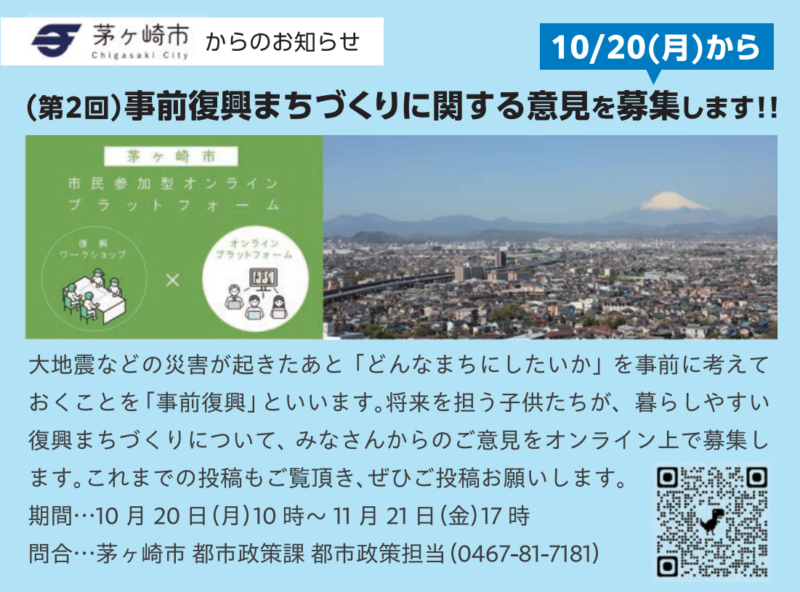 【茅ヶ崎市からのお知らせ】(第2回)事前復興まちづくりに関する意見を募集します!