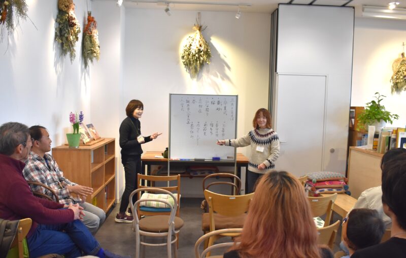 「3月といえば?」や「好きな飲み物は?」をテーマに参加者みんなで言葉を出し合い、手話表現を練習しました。